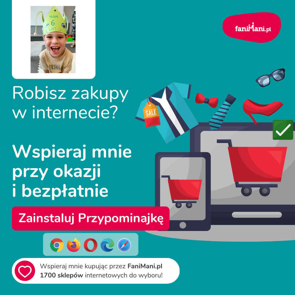 Pomagaj bezpłatnie przy okazji zakupów w internecie Płacisz tyle, co zawsze, a średnio 2,5% wartości Twoich zakupów trafi do organizacji, którą wybierzesz