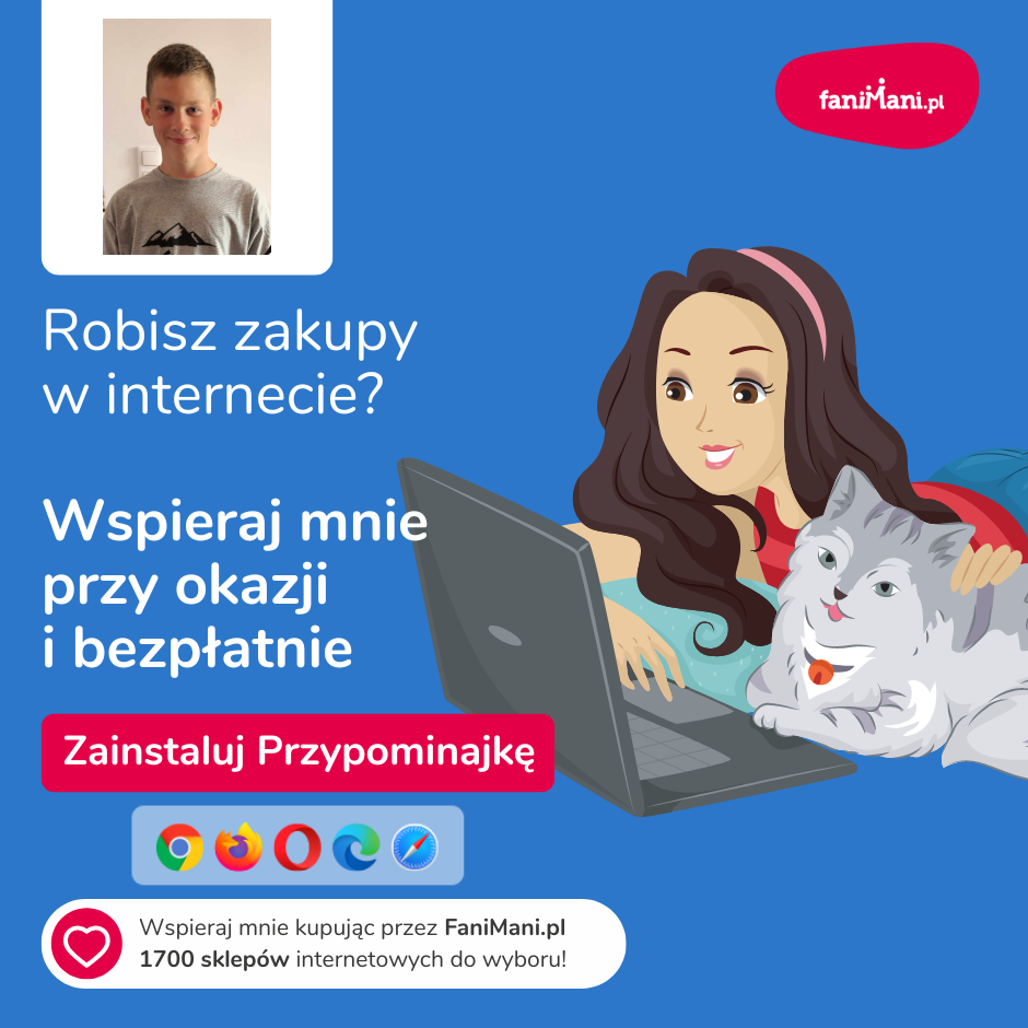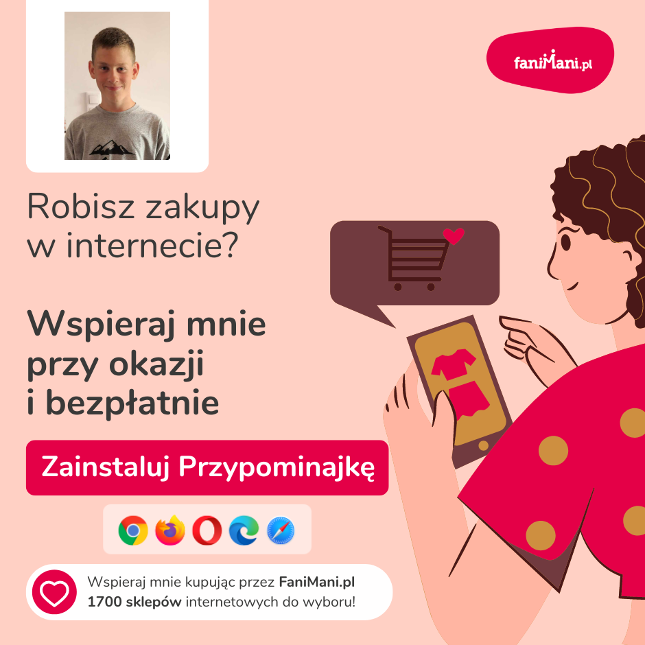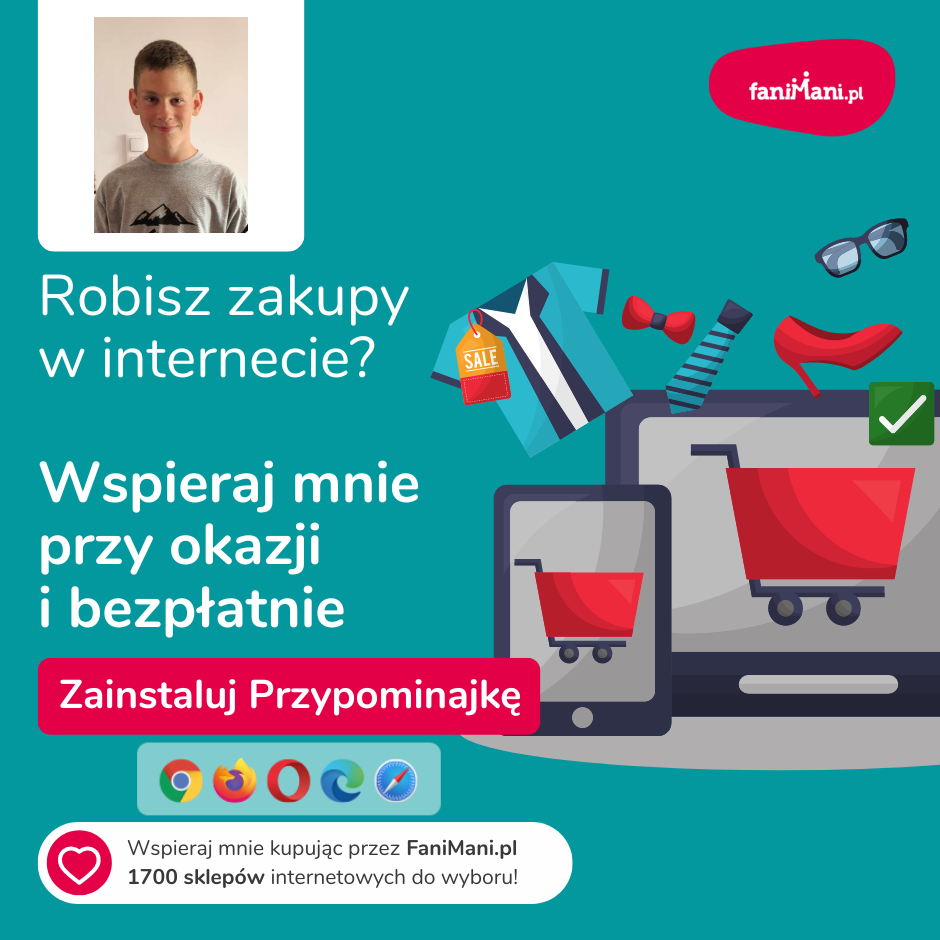 Pomagaj bezpłatnie przy okazji zakupów w internecie Płacisz tyle, co zawsze, a średnio 2,5% wartości Twoich zakupów trafi do organizacji, którą wybierzesz