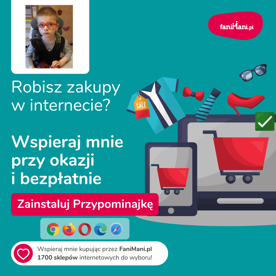 Pomagaj bezpłatnie przy okazji zakupów w internecie Płacisz tyle, co zawsze, a średnio 2,5% wartości Twoich zakupów trafi do organizacji, którą wybierzesz