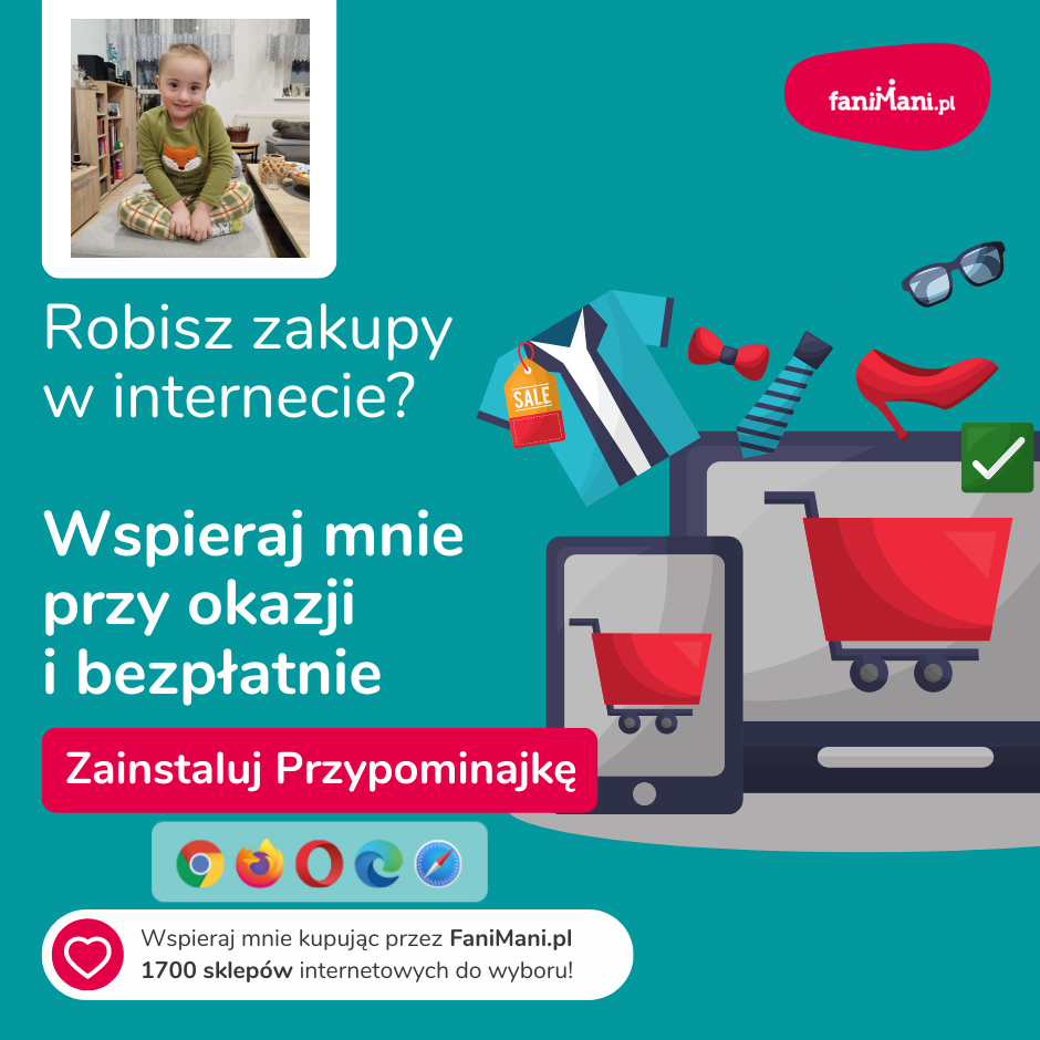 Pomagaj bezpłatnie przy okazji zakupów w internecie Płacisz tyle, co zawsze, a średnio 2,5% wartości Twoich zakupów trafi do organizacji, którą wybierzesz