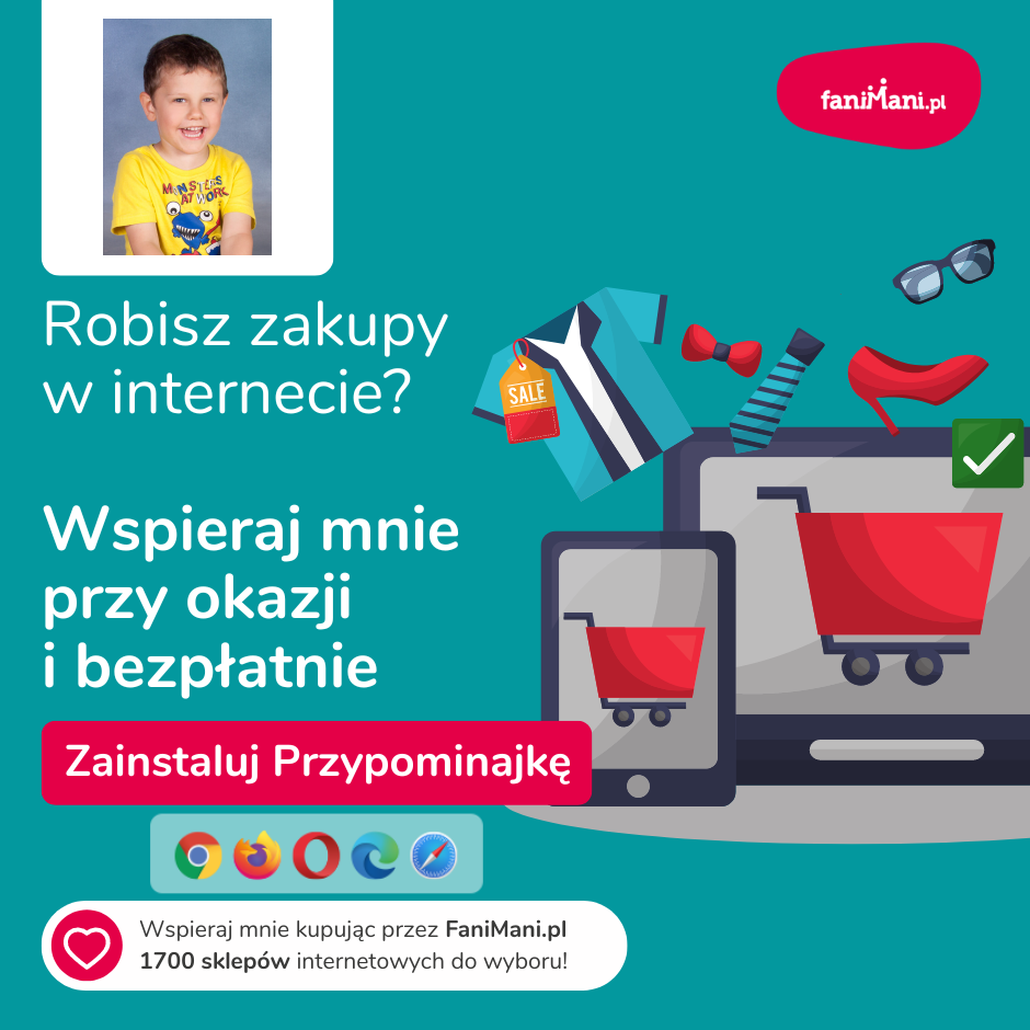 Pomagaj bezpłatnie przy okazji zakupów w internecie Płacisz tyle, co zawsze, a średnio 2,5% wartości Twoich zakupów trafi do organizacji, którą wybierzesz