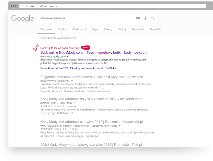 Już w wynikach wyszukiwania zobaczysz, który sklep umożliwi Ci wsparcie wybranej przez Ciebie organizacji.