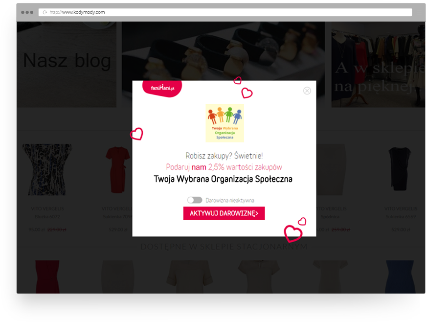 • Po wejściu na stronę sklepu internetowego zobaczysz komunikat, przez który aktywujesz darowiznę.
