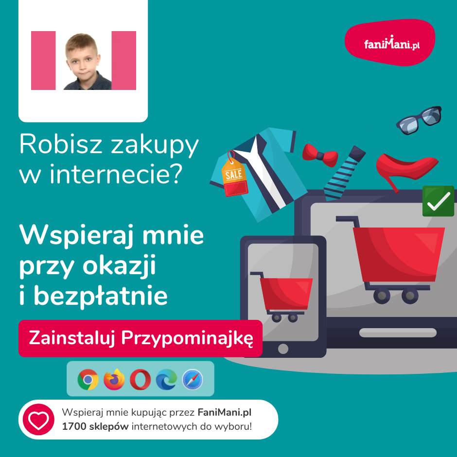 Pomagaj bezpłatnie przy okazji zakupów w internecie Płacisz tyle, co zawsze, a średnio 2,5% wartości Twoich zakupów trafi do organizacji, którą wybierzesz