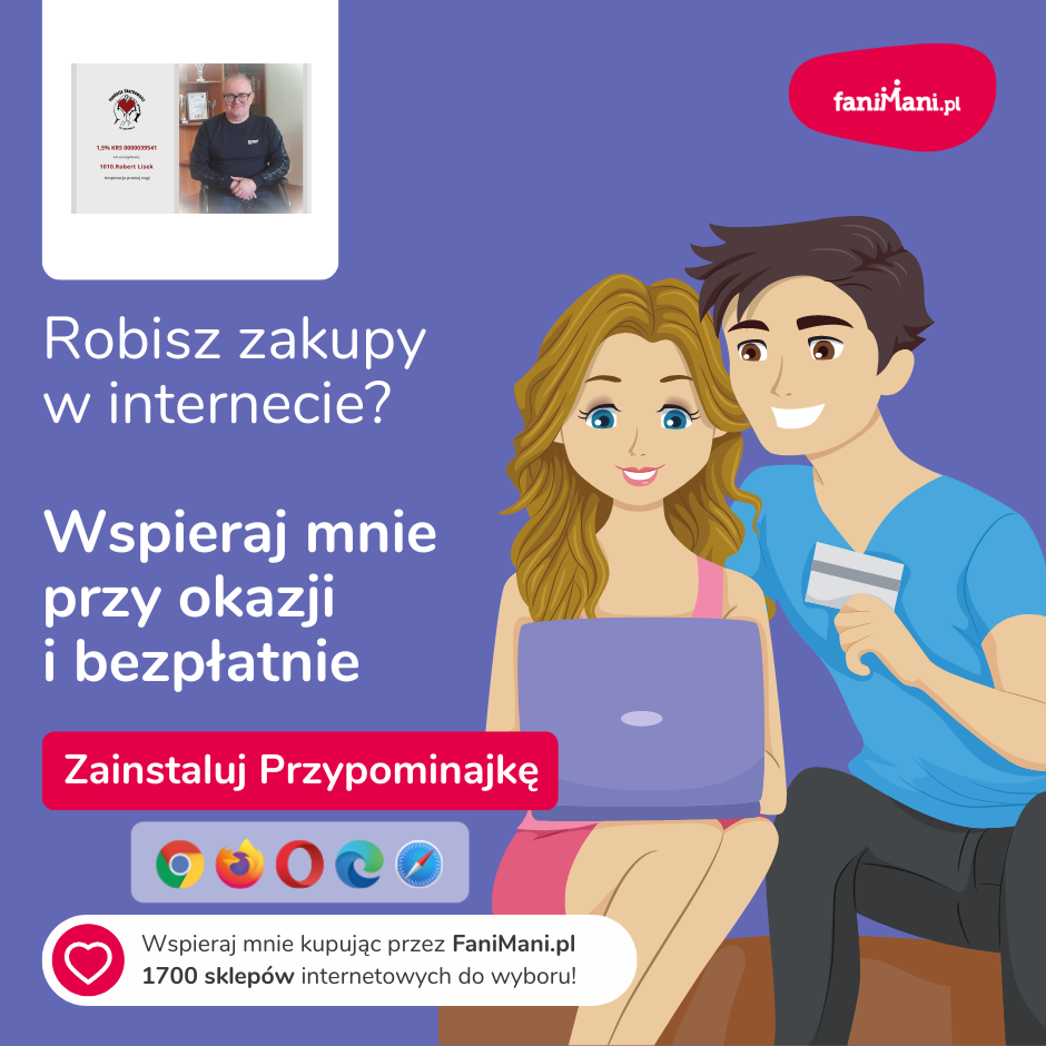 Pomagaj bezpłatnie przy okazji zakupów w internecie Płacisz tyle, co zawsze, a średnio 2,5% wartości Twoich zakupów trafi do organizacji, którą wybierzesz