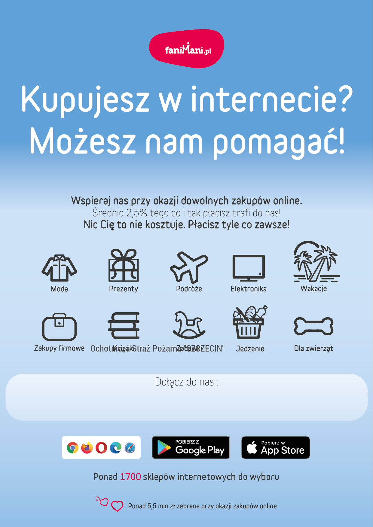 Pomagaj bezpłatnie przy okazji zakupów w internecie Płacisz tyle, co zawsze, a średnio 2,5% wartości Twoich zakupów trafi do organizacji, którą wybierzesz