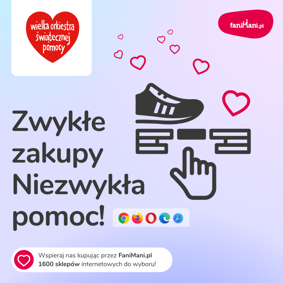Pomagaj bezpłatnie przy okazji zakupów w internecie Płacisz tyle, co zawsze, a średnio 2,5% wartości Twoich zakupów trafi do organizacji, którą wybierzesz