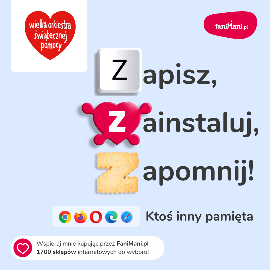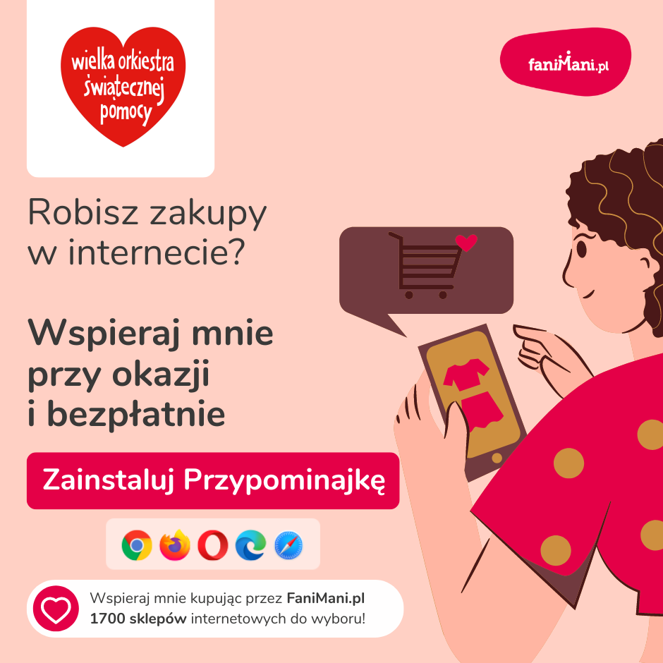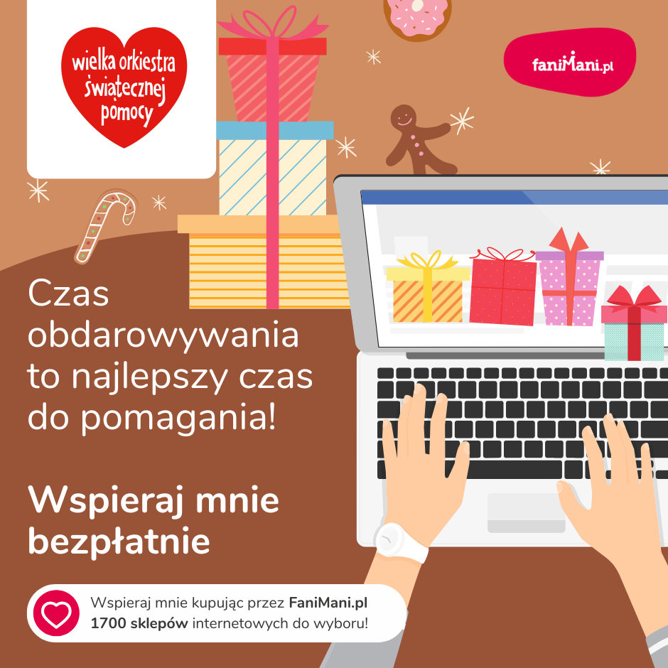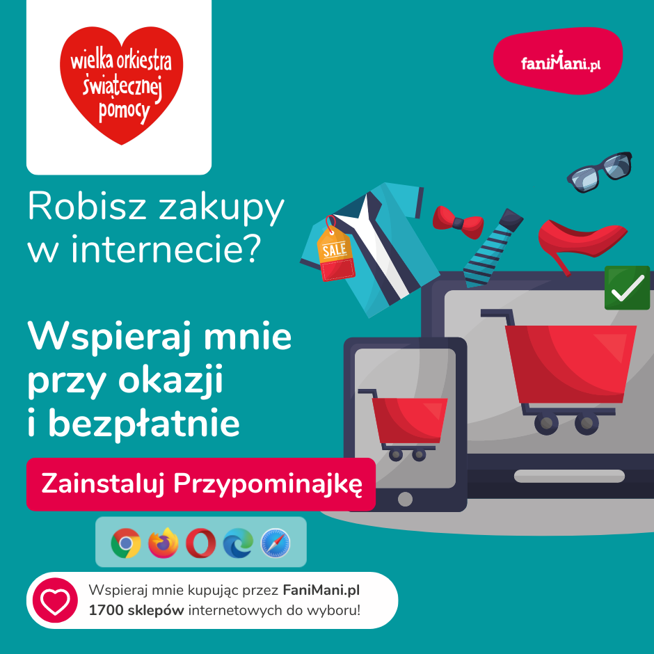 Pomagaj bezpłatnie przy okazji zakupów w internecie Płacisz tyle, co zawsze, a średnio 2,5% wartości Twoich zakupów trafi do organizacji, którą wybierzesz