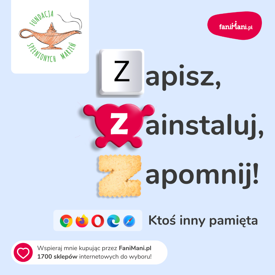 Pomagaj bezpłatnie przy okazji zakupów w internecie Płacisz tyle, co zawsze, a średnio 2,5% wartości Twoich zakupów trafi do organizacji, którą wybierzesz