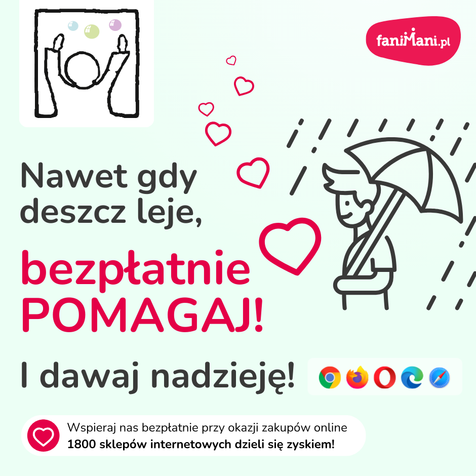 Pomagaj bezpłatnie przy okazji zakupów w internecie Płacisz tyle, co zawsze, a średnio 2,5% wartości Twoich zakupów trafi do organizacji, którą wybierzesz