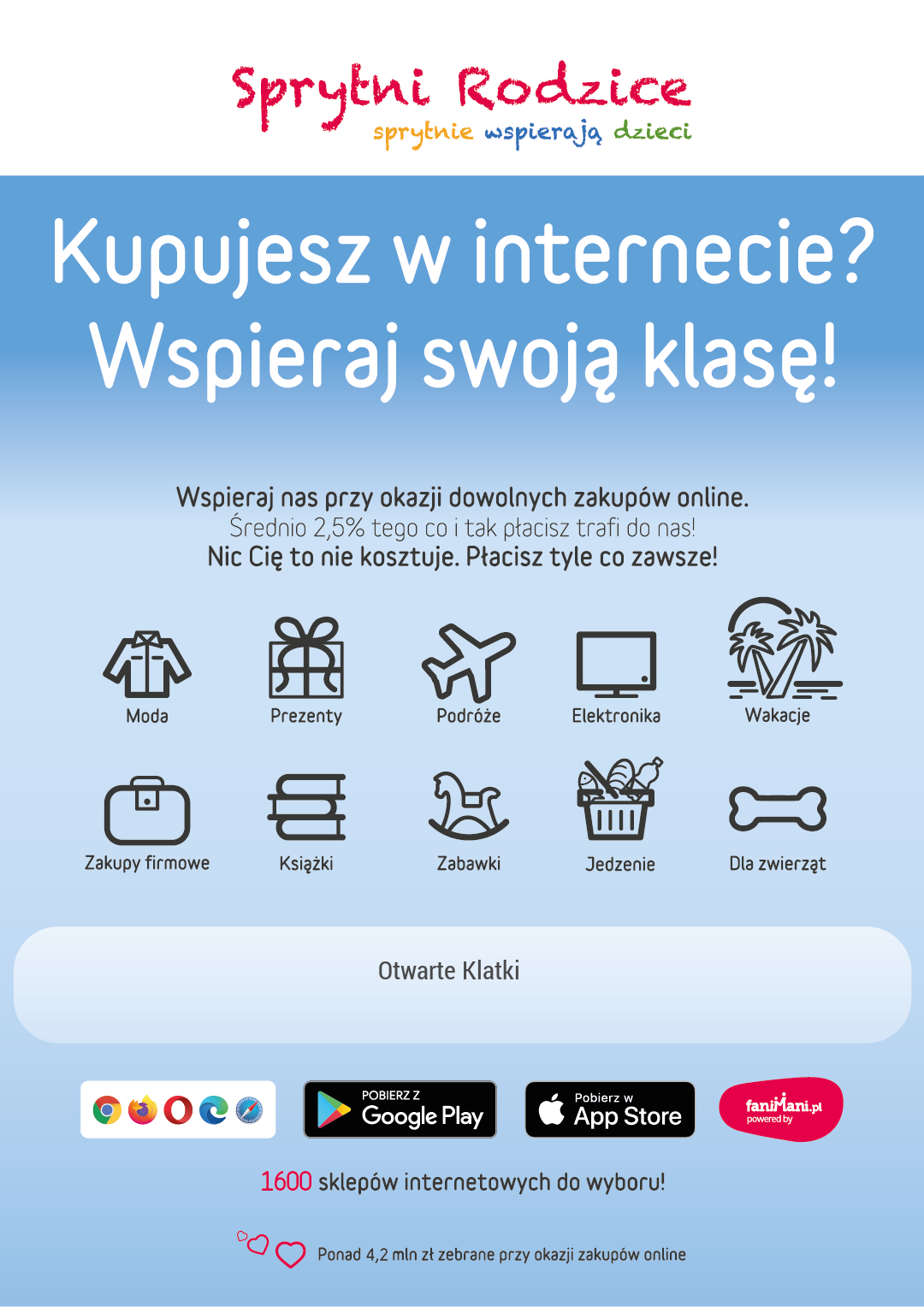 Pomagaj bezpłatnie przy okazji zakupów w internecie Płacisz tyle, co zawsze, a średnio 2,5% wartości Twoich zakupów trafi do organizacji, którą wybierzesz