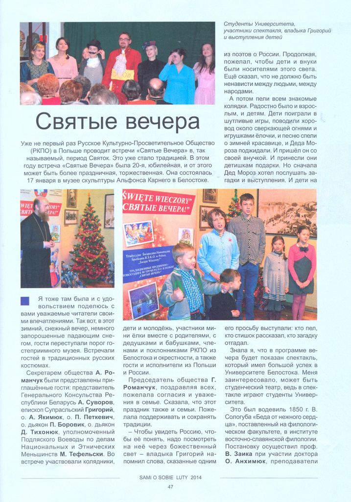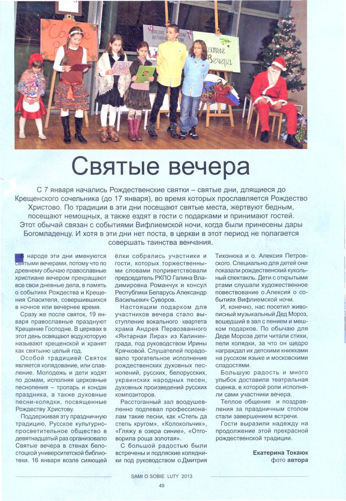 Święte Wieczory to spotkania świąteczne odbywające się w tak zwanym okresie "Svjatok", czyli czasie pomiędzy Bożym Narodzeniem a Chrztem Pańskim, spotkanie z kolędami i kolędnikami, tradycyjnym Dziadkiem Mrozem i prezentami, wspólnym śpiewaniem i występami artystycznymi.