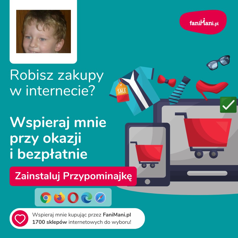 Pomagaj bezpłatnie przy okazji zakupów w internecie Płacisz tyle, co zawsze, a średnio 2,5% wartości Twoich zakupów trafi do organizacji, którą wybierzesz