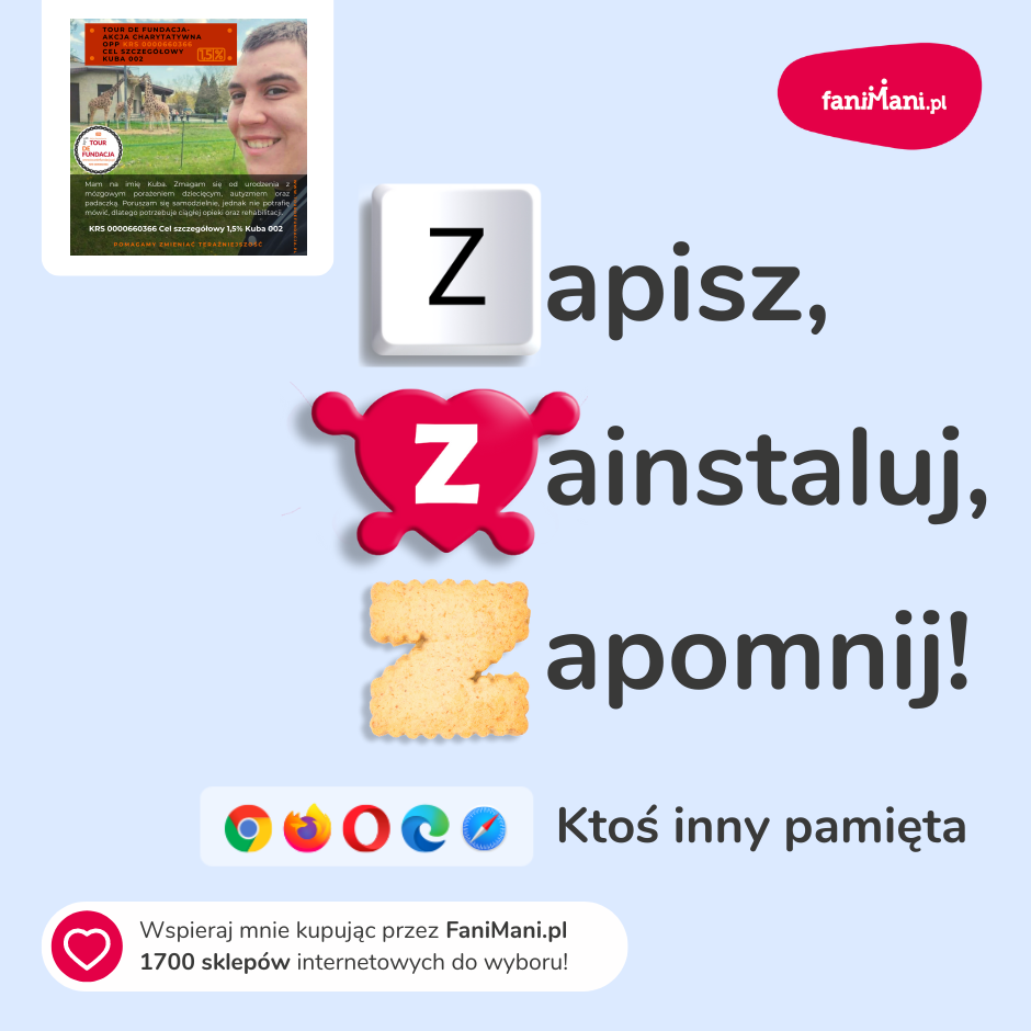 Pomagaj bezpłatnie przy okazji zakupów w internecie Płacisz tyle, co zawsze, a średnio 2,5% wartości Twoich zakupów trafi do organizacji, którą wybierzesz